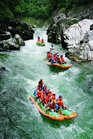 此段漂流全程約需5個(gè)小時(shí),也可以只漂半程,那是從哈尼宮到泥路河大橋這一段,需要三個(gè)小時(shí)。如果是全程漂流,到達(dá)猴兒跳后,會(huì)有游船載開往芙蓉鎮(zhèn),全程約需2個(gè)小時(shí)。如是早上開始漂,可以漂全程,然后去芙蓉鎮(zhèn)上游玩;如果是下午開始漂,就只來得及漂半程了。漂流時(shí)一般6至10人乘一艘皮筏,每人均會(huì)穿上救生衣,船由當(dāng)?shù)佤构,所以有驚無險(xiǎn)。 |