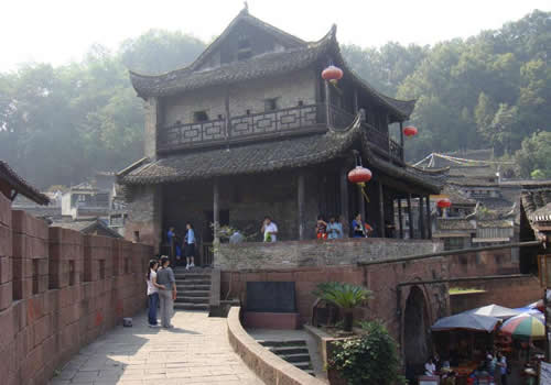 東門城樓位于城東,緊靠沱江,原名"升恒門",為鳳凰古城四大城門之一。 東門城樓始建于清康熙五十四年(1715年),城門下部由紫紅砂巖砌成,上部城樓則用古磚砌筑。城門寬3.5米,高4米,呈半圓拱,兩扇城門都用鐵皮包裹,用圓頭鐵釘密釘,牢實堅固。城墻修筑全部用紅砂條石,精工細鉆,規(guī)格一致,城墻厚0.8米,下部內外兩側用條石加石灰漿砌成,中間填以碎石粘土,層層夯實;頂部的中間填充物改為石灰、鵝卵石、黃土拌成的三合土,厚約0.33米,上面鋪以紅砂塊石。城樓高11米,大門上方有槍眼8孔。歇山屋頂,覆以腰檐,飛檐翹角,精美壯觀。