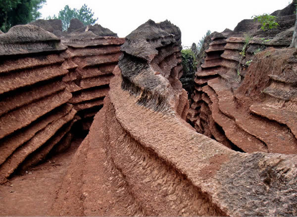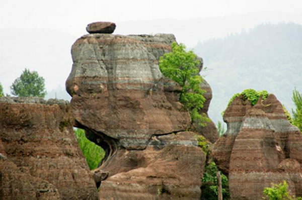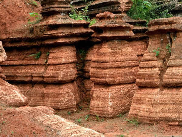 紅石林 告別船工后一切便突然安靜下來,過山谷的小路沒有人家,偶爾傳來幾聲清脆的鳥叫。穿過幾座隘口,峰回路轉(zhuǎn)后“石林”漸漸露臉,石頭的顏色是由灰白到棕紅,變幻而又使人聯(lián)想。間或一棵參天大樹,或是綠竹三兩棵,則又是另一番景致了。于高于低、于肥于瘦的石林,于石于樹、于濃于淡的色彩,顯得雄奇又雋秀,并透露出一種清靈飄逸。 這些石柱不但顏色各異,而且大小不等。有的高達(dá)七、八米,而有些則像半埋于地下的巨獸骨架。一位村民告訴記者,現(xiàn)在石林沒有以前壯觀,都長(zhǎng)渣子(灌木)了。原因是由于山頂樹木減少,雨水將泥土帶下山,很多石頭都被埋在土下,后來這些地方都開墾了農(nóng)田,石林也被永久覆蓋。 由于泥土覆蓋,石林被切割成一個(gè)個(gè)小區(qū)域,有些隱蔽在果林中,而有些則像突然從天而降,散落田間。