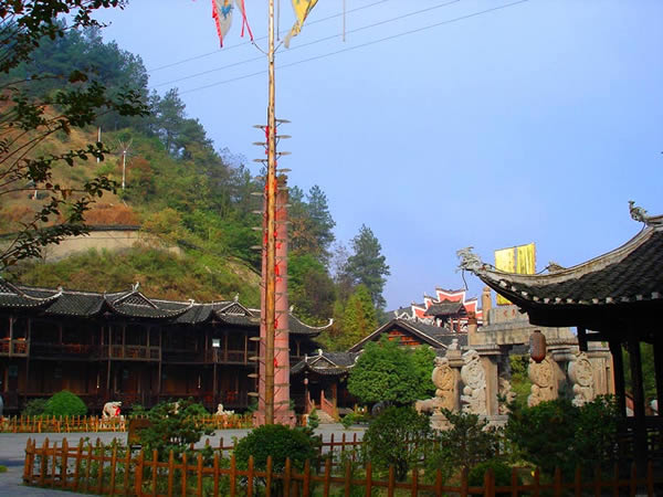 土司城 土司制度初建于五代十國時(shí)期,到了明朝己非常成熟了,土司王有無上的權(quán)威,在湘西有三大土司王分別是桑植土司向氏、永順土司王彭氏、慈利土司王張氏,其中又以永順溪州土司彭氏實(shí)力最強(qiáng)。其它土司王都為自己修建一座土司城,唯有彭氏分別在永定、永順修建了二座土司城。在永定的土司城內(nèi),彭氏為顯示其地位,修建了湘西最高的一座高達(dá) 48米,共12層的吊腳樓,整棟樓竟無一根鐵釘,堪稱土家吊腳樓建筑史上的奇跡,此樓于2002年9月被評(píng)為最高吊腳樓,榮獲世界吉尼斯之最,與此同時(shí)土司城內(nèi)舉辦一千人參加表演的毛古斯舞蹈活動(dòng)獲得圓滿成功,同時(shí)獲得世界吉尼斯之最。進(jìn)入土司城,首先看到土司城迎賓儀式,土家漢子迎賓鼓,吹牛角、放沖,土家姑娘攔門歌,敬攔門酒,進(jìn)入城內(nèi),在祭祀堂前舉行百人土家大祭祖活動(dòng),男女老少唱擺手歌、跳擺手舞,登世界最高的吊腳樓九重天,參觀土家族千百年來文化展示。到土家山寨,聽土家歌,賞土家族最有代表風(fēng)俗哭嫁,三棒鼓,花燈等民俗表演。