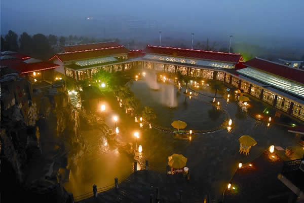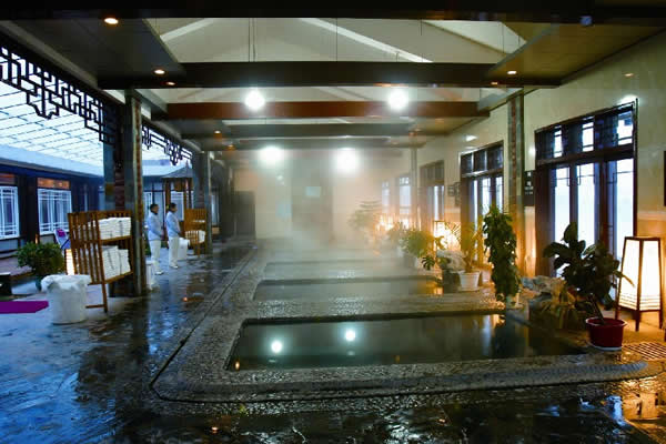 江埡溫泉主要硬件特色是高標(biāo)準的自然園林式露天溫泉與室內(nèi)溫泉,建有同心池、六福湯、瀑布溫泉、石板溫泉、椰奶溫泉、花草溫泉、咖啡溫泉、紅酒溫泉等,布局體現(xiàn)出鄉(xiāng)土格調(diào),鵝卵石、青石板鋪地, 假山瀑布,小橋流水,20余種各賦特色、各具功能的溫泉池鑲嵌其中, 一派恬淡寧靜的詩情畫意。