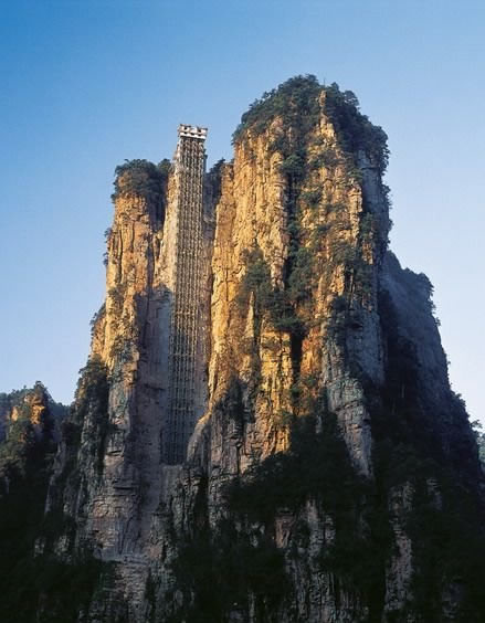 百龍電梯圖片 百龍?zhí)焯輾鈩?shì)恢宏,垂直高差335米,運(yùn)行高度326米,由154米山體內(nèi)堅(jiān)井和172米貼山鋼結(jié)構(gòu)井架等組成,采用三臺(tái)雙層全暴露觀光電梯并列分體運(yùn)行,每臺(tái)次載客50人次,運(yùn)行速度3米/秒,三臺(tái)同時(shí)運(yùn)行每小時(shí)往返量達(dá)4000人次。百龍?zhí)焯莸男藿▽?shí)現(xiàn)“山上游,山下住”的目標(biāo),提供了交通保障,將袁家界天下第一橋、迷魂臺(tái)、天懸白練以及烏龍寨、楊家界等絕世美景從幕后推向了前臺(tái),并將天子山、袁家界、金鞭溪等精品旅游線路連為一體,解決了多年困擾景區(qū)的交通瓶頸問(wèn)題。