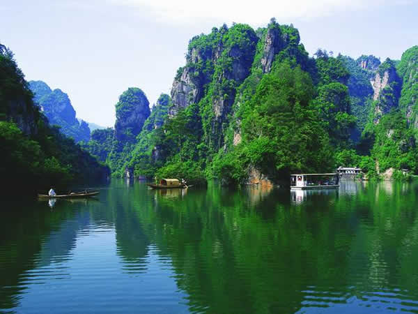 寶峰湖瀑布 湖中有兩座疊翠小島,近岸奇峰屹立,峰回水轉(zhuǎn)。泛舟漫游,只見一湖綠水半湖倒影,充滿詩(shī)情畫意。“云梯萬(wàn)丈上天臺(tái),高峽平湖一鑒開,王母瑤池金扶,浣沙仙女下凡來(lái)”游寶峰湖,你就會(huì)欣賞到這樣的詩(shī)情畫意。群峰擁抱的寶峰湖,長(zhǎng)約2.,5公里,湖猶如一面寶鏡,四面青山,一泓碧水,蕩槳溫游,格外愜意。坐在船上,環(huán)顧四周,千山聳翠,俯視水中,倒影慢移,碧水照相館得群峰綠,人面桃花水映紅。真是靜極了,美極了!韓劇《九天洞》拍攝的湖水就是寶峰湖。