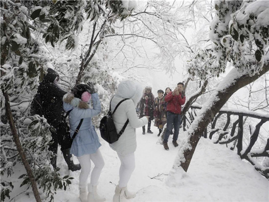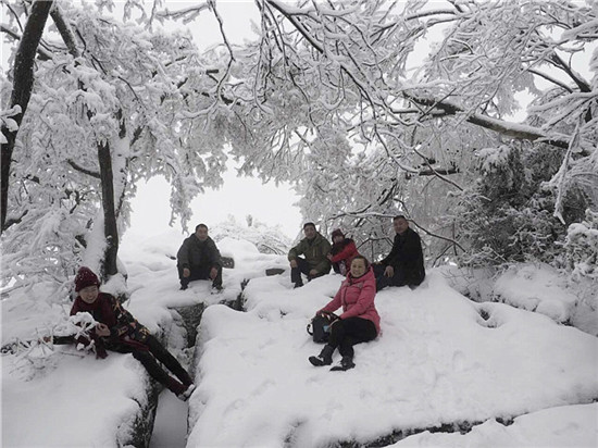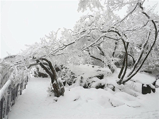 山頂上樹林不見了,取而代之的是形態(tài)各異的雪凇、冰掛;林間游道上覆蓋了厚厚的白雪,踩上去咯吱作響;絕壁上的棧道雪白一片,仿若是一條仙境之路...游客們玩雪、賞雪不亦樂乎。