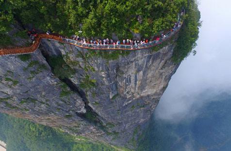 站在棧道上俯瞰群山,古人“會當(dāng)凌絕頂,一覽眾山小”的感覺油然而生。由于天門山是國家森林公園,植被特別豐富,加上典型的喀斯特地貌,所以,在這條棧道上更能找到一種在乘坐直升飛機飛越熱帶雨林大峽谷的感覺,這平時只能在電影里看到的場景,在這里能讓你身臨其境。