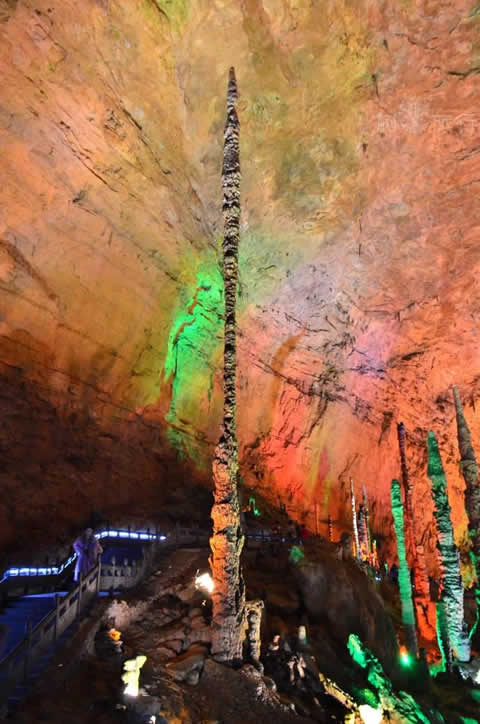 過烏龍泉東行1500米左右,一堵石壁上有一道深4米,高3米,長40多米的凹槽,凹槽上有一直徑約80厘米的洞眼,泉水從中流出。洞內(nèi)有一狹長露天石槽,高10米許,長2000多米,寬僅0.4米,游人進洞,僅可側(cè)行。走完狹槽,復(fù)入一洞,高達30多米,寬20余米,長約200米。洞壁、洞頂皆聳立或懸垂著琳瑯滿目的鐘乳石,或大或小,或長或短,淺紅,淡黃,灰白,鐵青,玲現(xiàn)剔透較大的柱狀鐘乳石400多根,均能敲出悅耳的樂音。